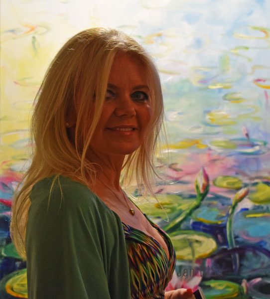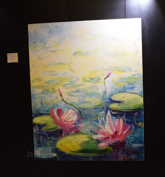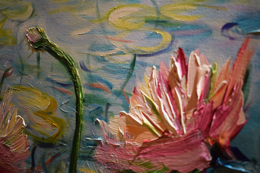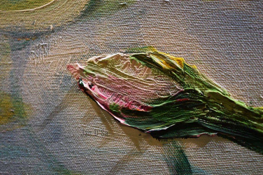 Her ability to use various paints, from transparent to opaque and thick impasto styles applied with the artist’s best friendly tool called the palette knife. Of her floral paintings, of which the layered bud technique had be intrigued. She was inspired by Monet and has used the palette knife technique to achieve the sense of realness of the flowers.